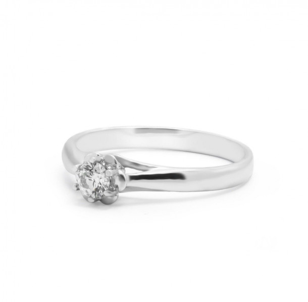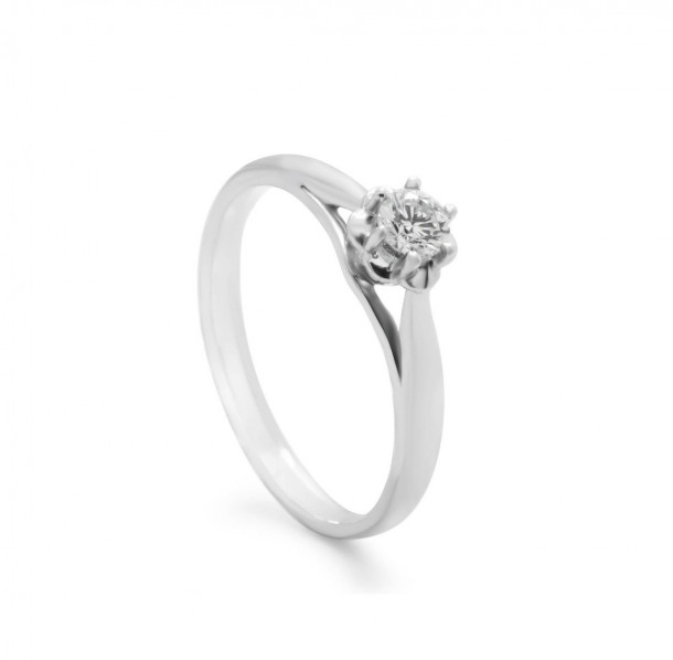 Pada bagian tengah cincin yang berbentuk menyerupai sebuah bunga yang tengah mekar sempurna1 butir berlian sebesar 0,18 karat digunakan untuk memperindah model cincin tunangan ini. Berlian tersebut memiliki tingkat kejernihan VVS-Vsbentuk potongan round diamond yang halus dan berada pada grade F. Bagi Anda yang menginginkan model cincin tunangan yang memiliki desain sederhana dan manismodel yang satu ini akan menjadi bahan pertimbangan yang menarik.
