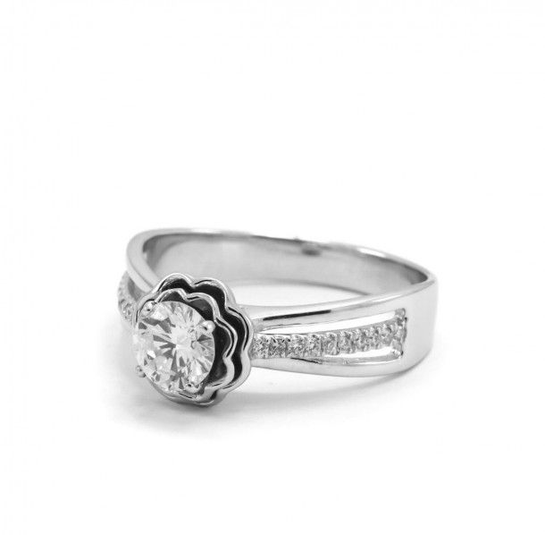 Untuk center diamond yang berada pada tengah cincin yang berbentuk bunga1 butir berlian yang dipergunakan memiliki karat sebesar 0,55 karatsedangkan untuk side diamondsnya sebesar 0,14 karat sebanyak 20 butir yang berada di kedua sisinya atau pada tengah triple lines. Jika Anda menginginkan tampilan cincin tunangan yang berbedacincin ini bisa menjadi pilihan yang tepat.
