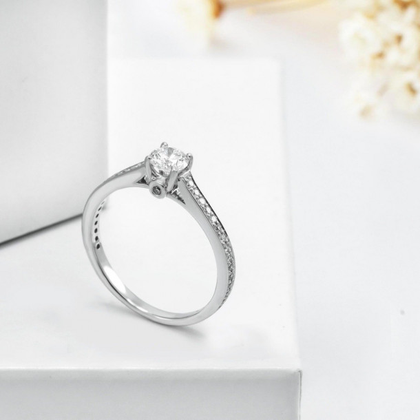 Berlian yang dipilih memiliki tingkat kejernihan VVS-Vsberada pada grade F dan berpotongan round diamond yang klasik. Pada bagian tengah1 butir berlian yang menjadi fokusnya sebesar 0,3 karatsedangkan pada bagian samping ada 30 butir berlian sebesar 0,16 karat yang akan membuatnya menjadi pilihan cincin tunangan sempurna untuk Anda.