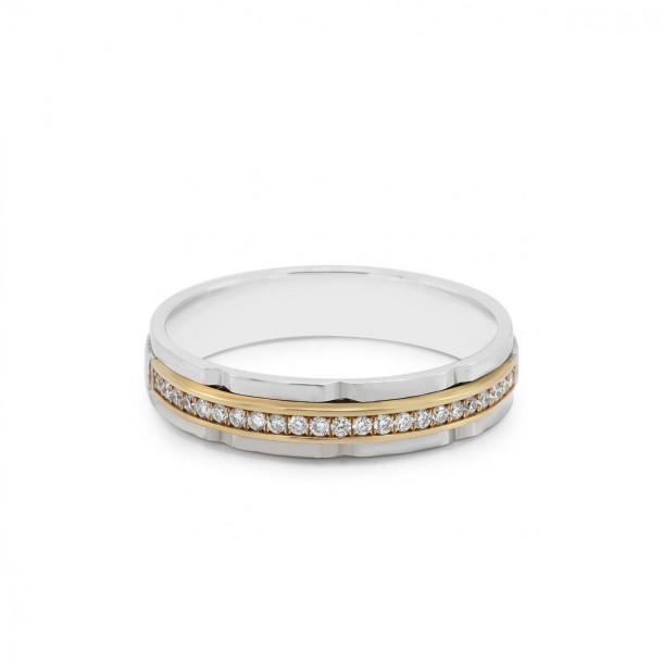 Bukan hanya satu, melainkan 23 butir berlian sebesar 0,17 karat berpotongan round diamond yang akan menjadi fokus utama cincin kawin emas putih ini. Rancangannya yang memiliki permukaan bergelombang didesain variasi cincin glossy dan doff yang akan membuat cincin kawin ini berkilau.