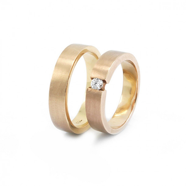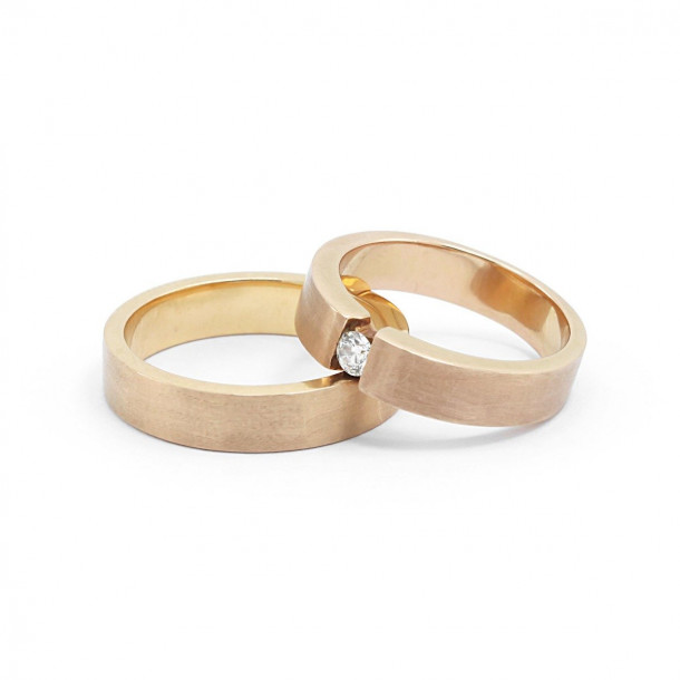 Cincin pria didesain polos tanpa berlian, sedangkan cincin wanita dihiasi sebuah berlian cantik yang ditanam di celah logam emas. Potongan berlian terbilang sangat bagus dengan warna yang mencapai grade F dan dapat memantulkan cahaya dengan baik. Tingkat kejernihan cincin pun berada pada tingkat Vvs hingga tidak terlihat cacat sedikit pun.